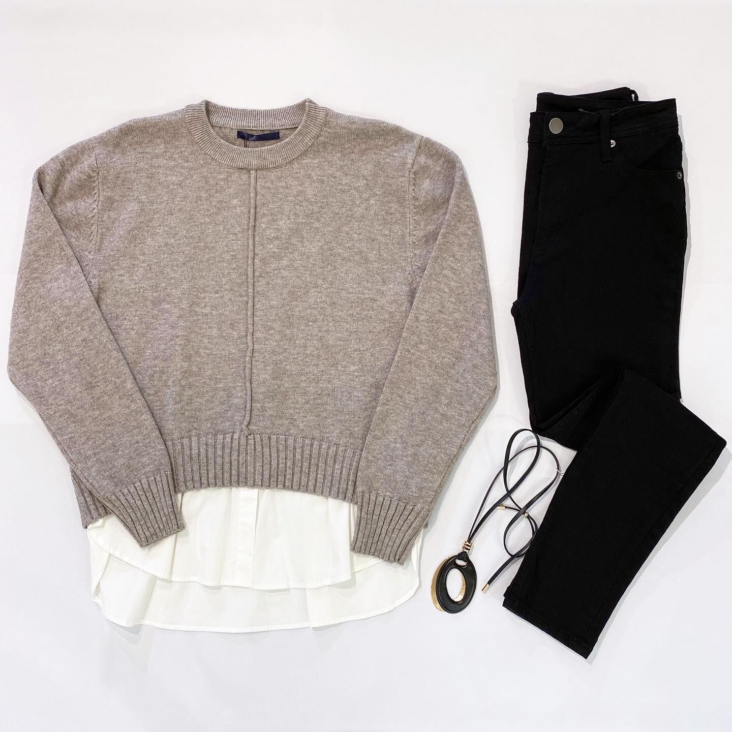 GLam別注 シャツドッキングニットPO ¥14,800 +税 size : Free col : グレー、ブラック mat : ビスコース50%、ポリエステル30%、ナイロン20% 【別布】綿100% 少し肉厚のニットの裾部分にシャツをドッキングさせたプルオーバーです。 首回りや切り替え部分の編み地を変えるなど、細かいディテールにも拘った一枚。 春先まで着回せる便利なニットアイテムです。