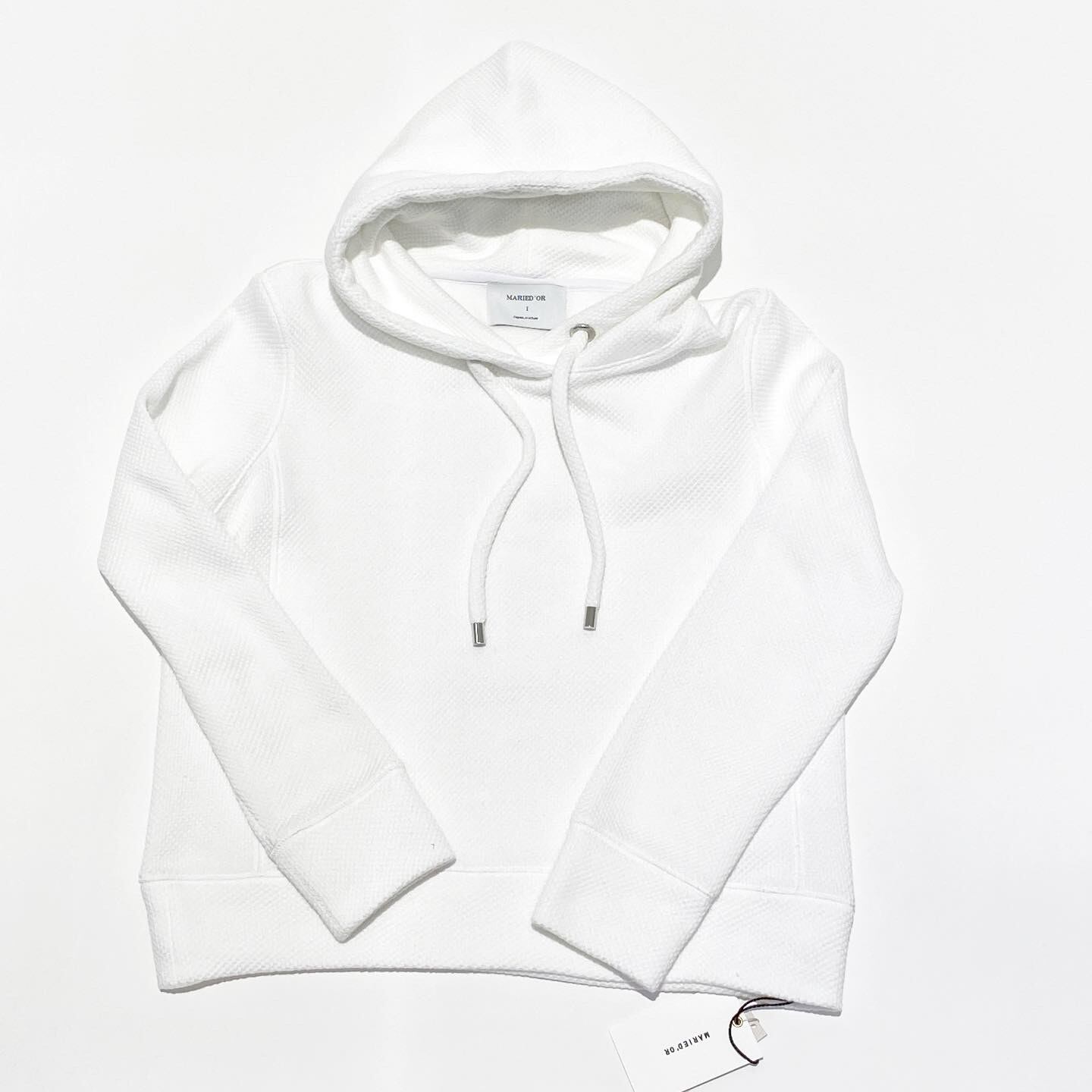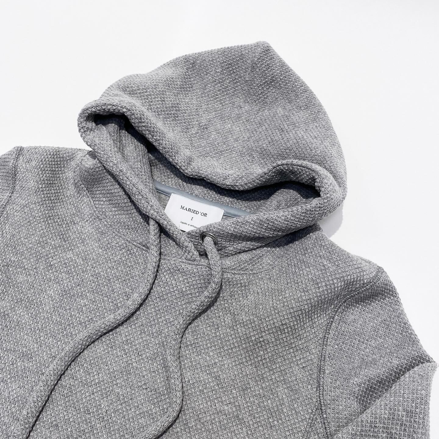 MARIE D’OR ストレッチカノコフーディー size : Free 着丈 : 56cm、バスト : 96cm col : オフホワイト、グレー杢 mat : 綿96%、ポリエステル3%、ポリウレタン1% ストレッチの効いた着心地の良さが魅力のフードプルオーバー。 アウターINにも適しているので、レイヤードスタイルもたのしめます。 同素材の太紐もポイントです。